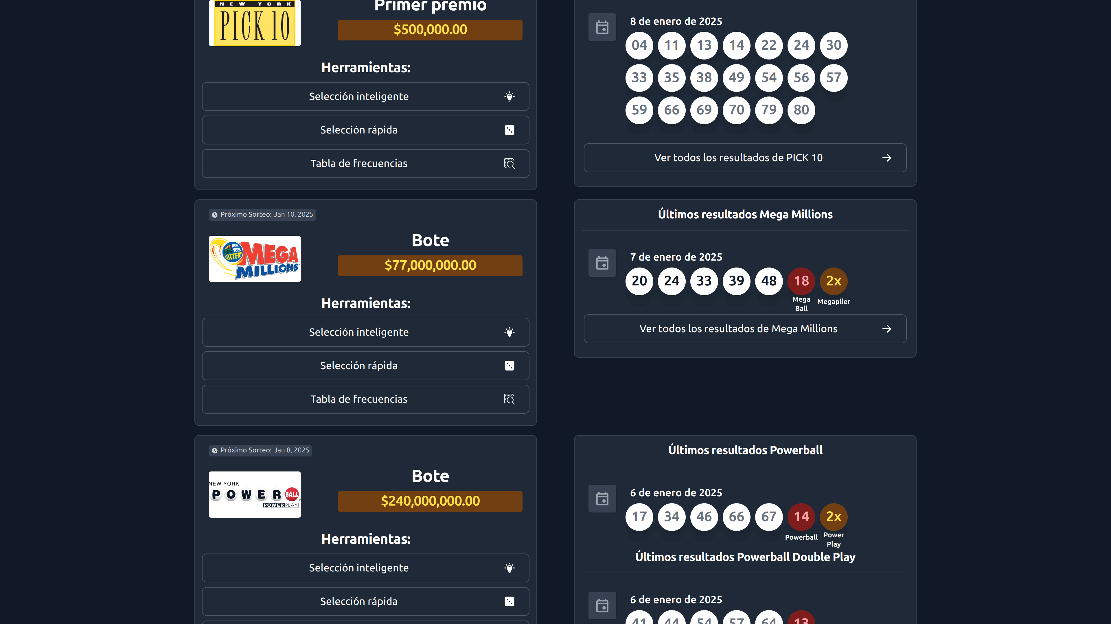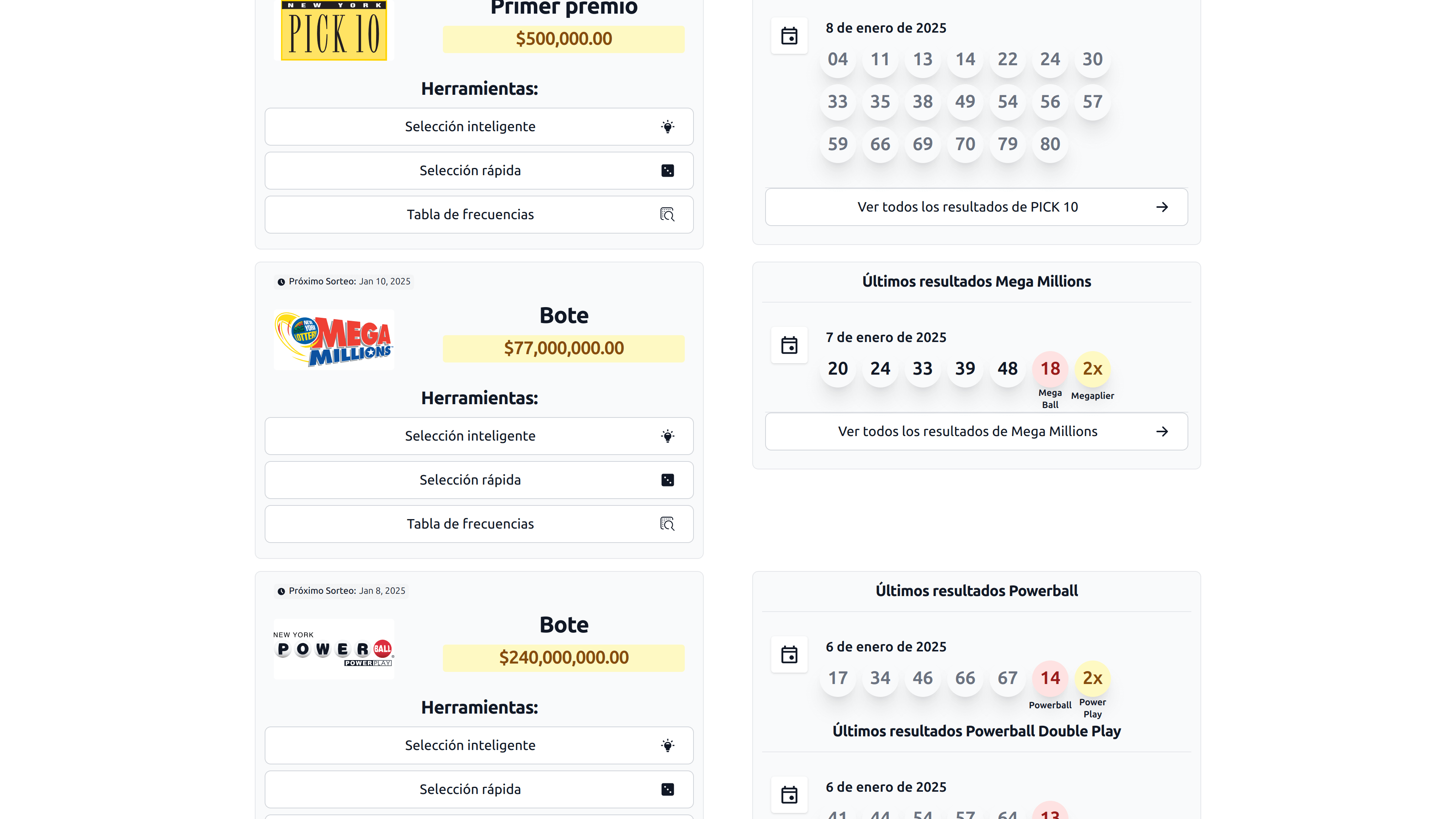 Selecciona tu juego de lotería favorito en nuestra plataforma. Ya sea Powerball, Mega Millions o un juego regional, nuestro sistema está diseñado para optimizar tus probabilidades en una amplia variedad de loterías. Si deseas jugar juegos en otro estado, simplemente elige un estado diferente. Nuestro sistema funciona para todos los juegos de lotería estatales.