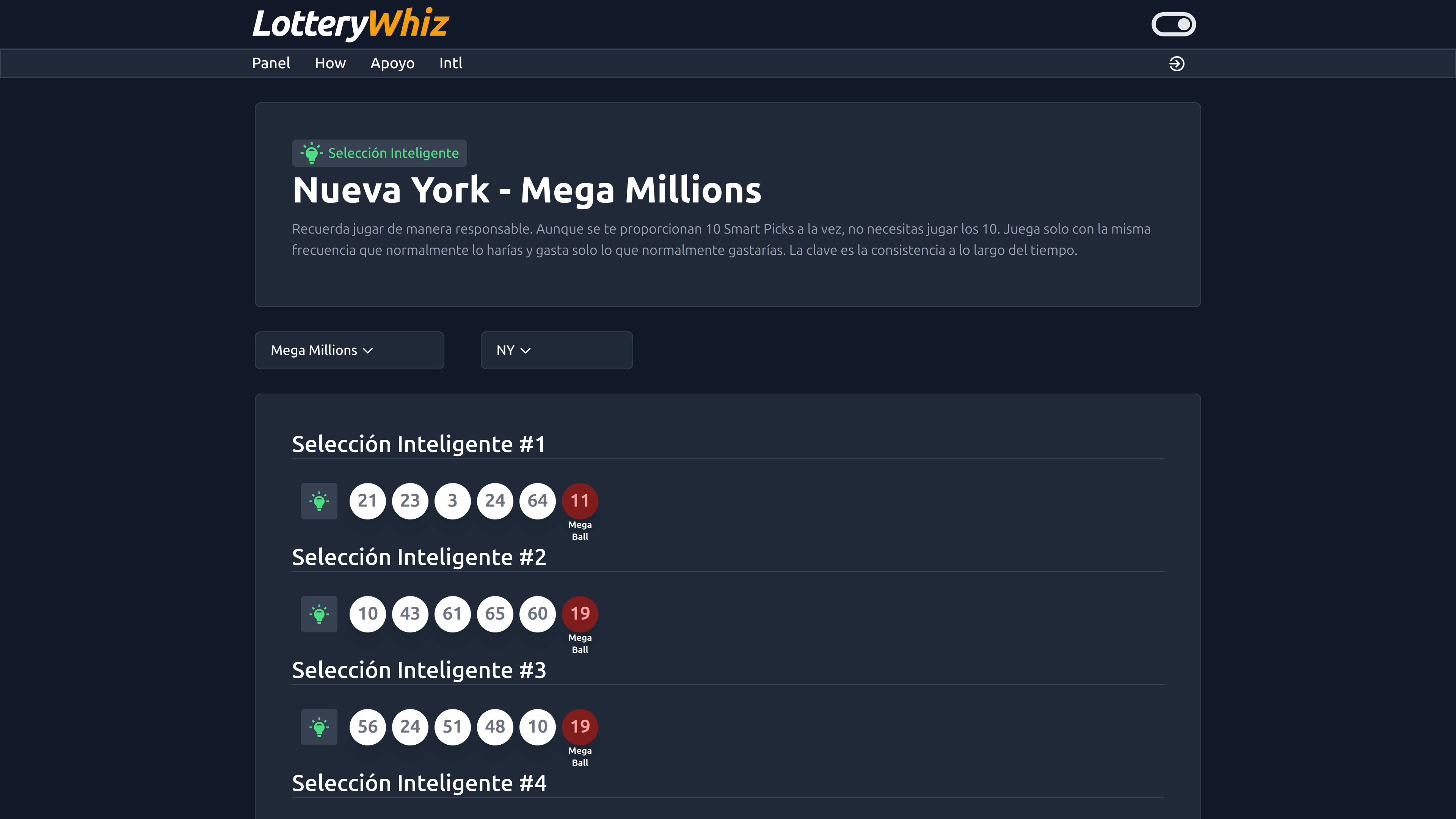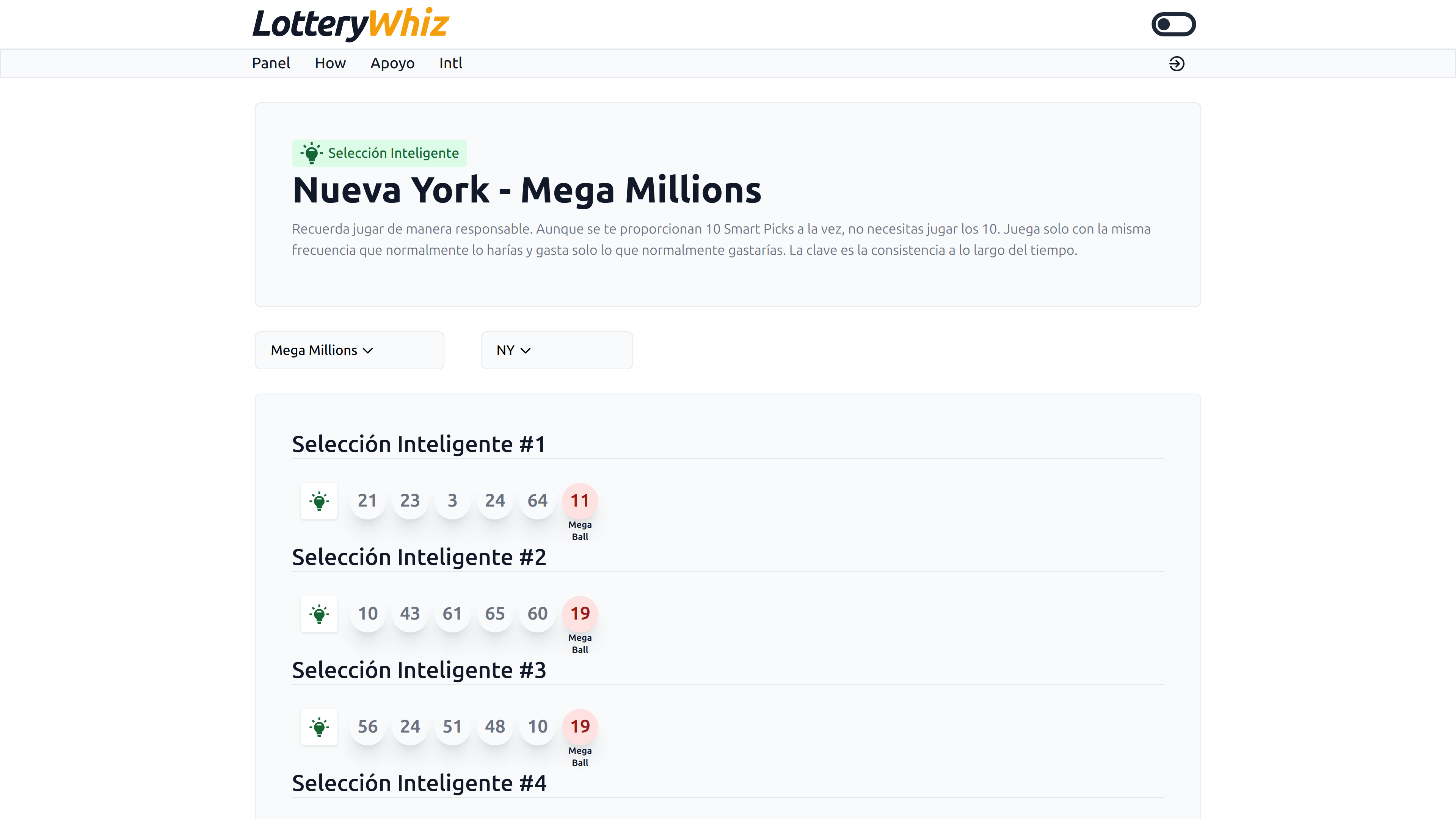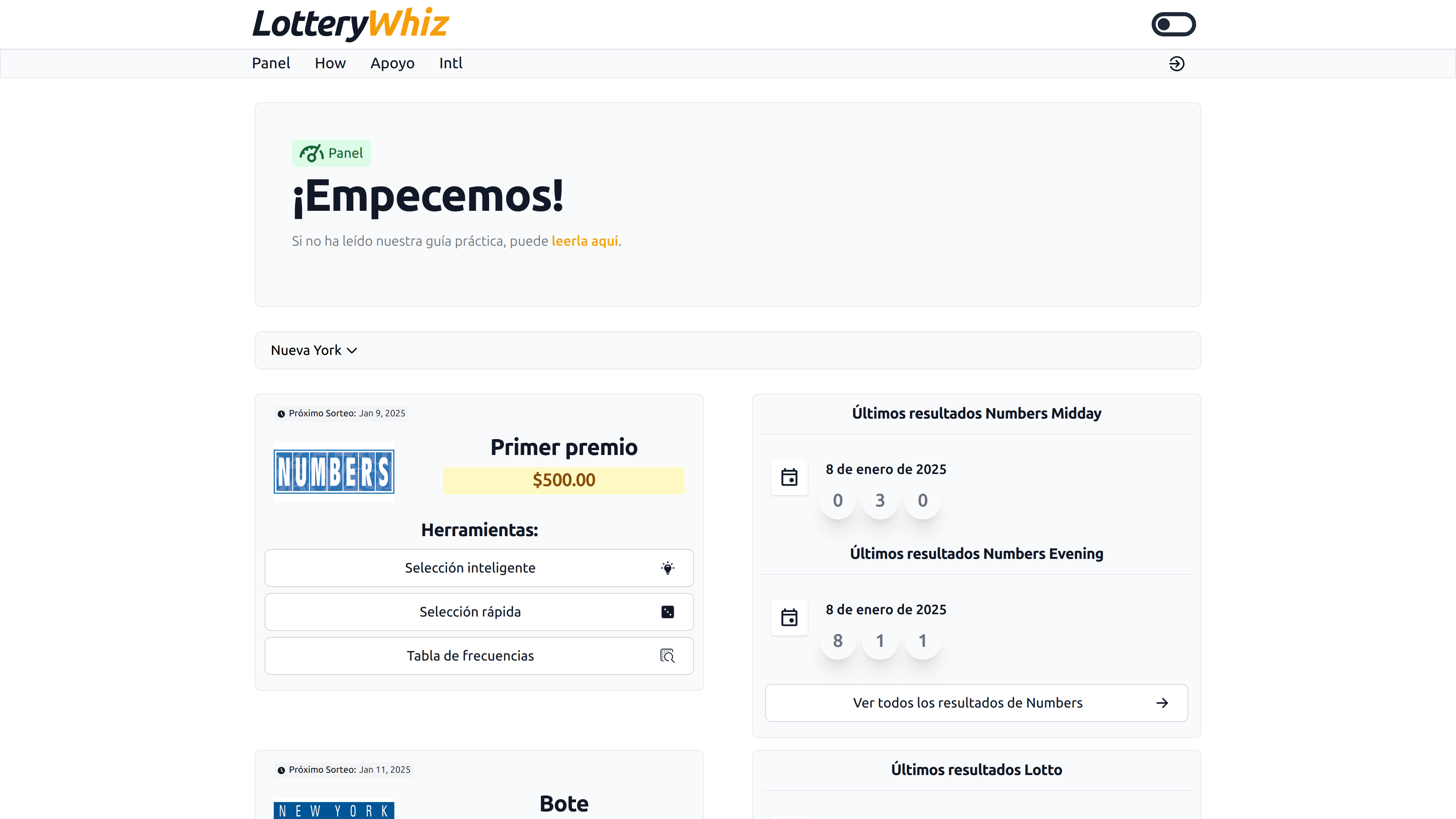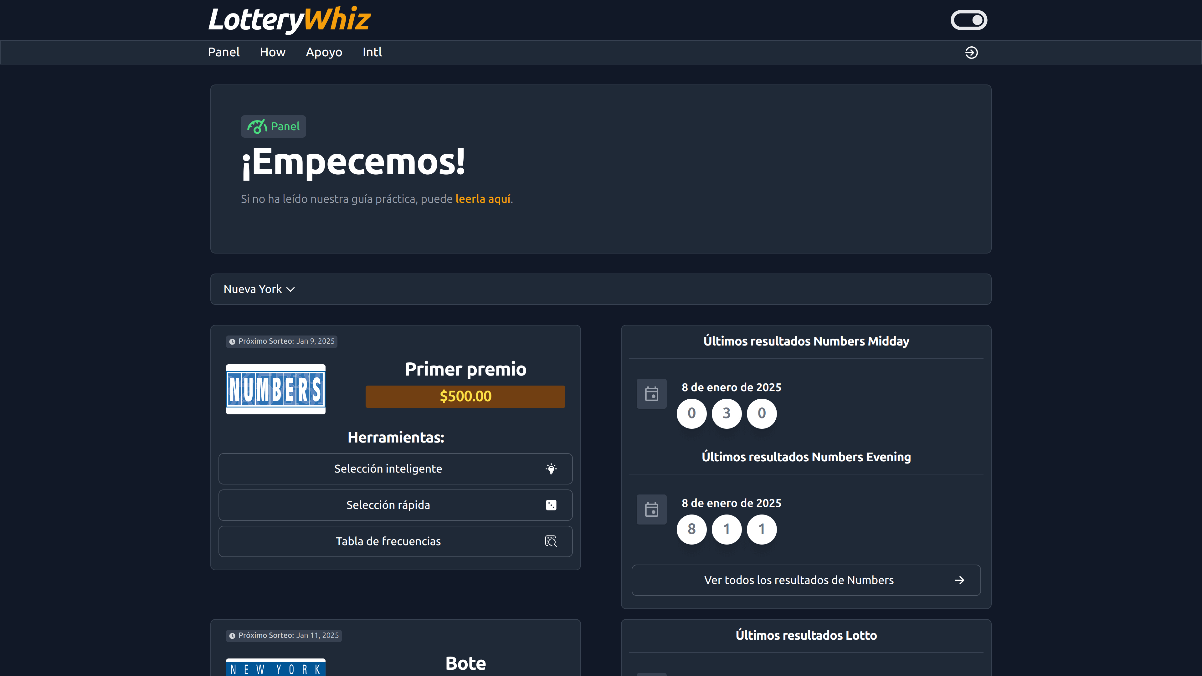 Comienza iniciando sesión en tu cuenta de Lottery Whiz. Si eres nuevo, registrarte es rápido y te da acceso instantáneo a nuestras recomendaciones de números exclusivos y herramientas. Tu panel personalizado incluye: